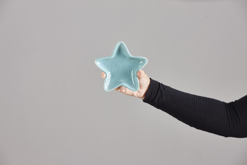 multi-colored pottery Plate placed on a rectangular wooden tray