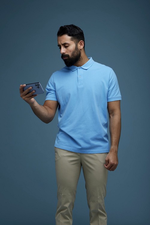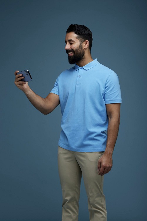 A man Watching a movie on his phone in a blue background wearing a Blue shirt