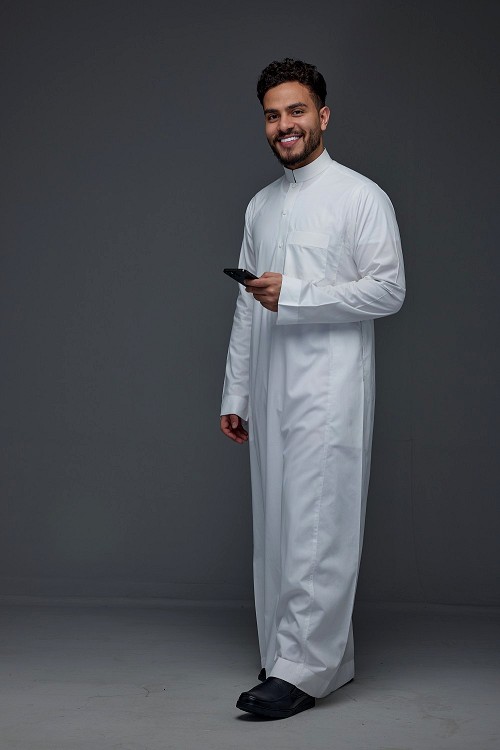 A Saudi man wearing Thobe standing and using his phone eye level on a gray background