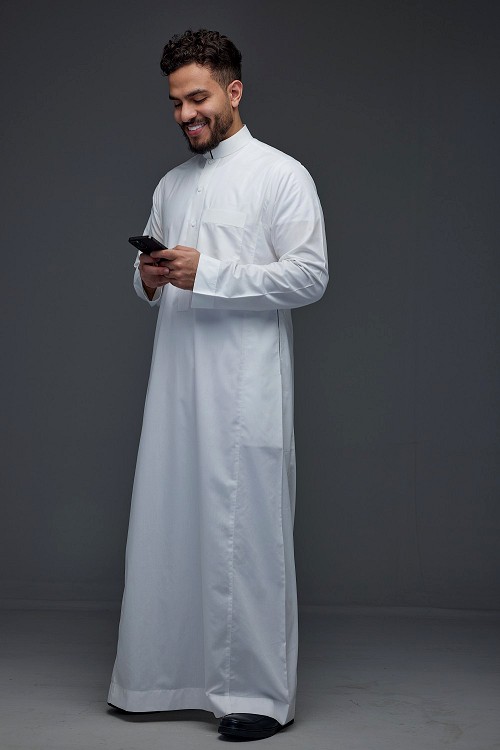 A Saudi woman Texting wearing Grey Abaya on a grey background