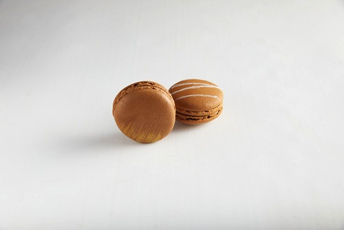 45º Shot of of two assorted Brown Irish Cream, and Brown Coffee macarons on white background