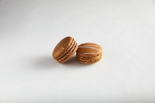 45º Shot of of two assorted Brown Irish Cream, and Brown Coffee macarons  on white background