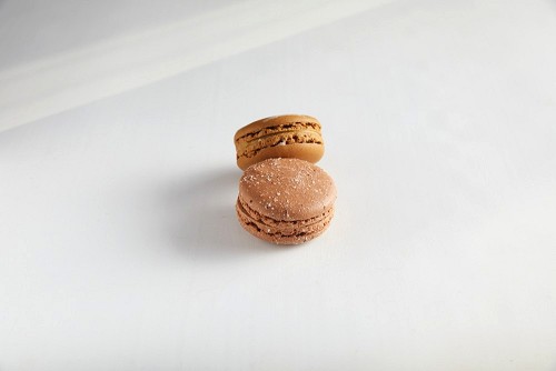 45º Shot of of two assorted Brown Irish Cream, and Brown Hazelnuts macarons on white background
