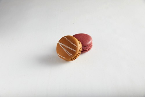 45º Shot of of two assorted Brown Irish Cream, and Red Velvet macarons on white background