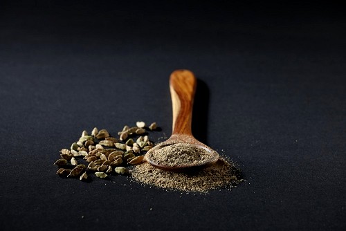 مغرفة خشبية ممتلئة ببودرة الهيل وحبوب الهيل بجانبها على خلفية سوداء