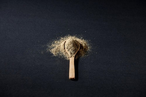 ملعقة خشبية ممتلئة ببودرة الهيل والبودرة تناثرت على خلفية سوداء