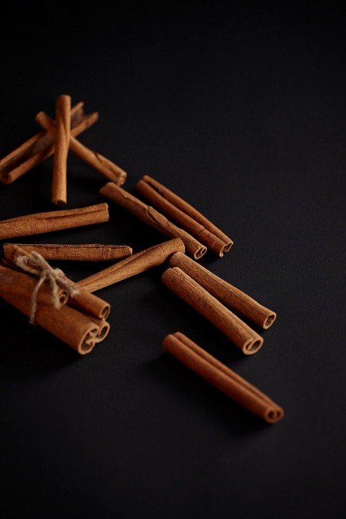 أعواد من القرفة مربوطة مع المزيد من أعواد القرفة علي خلفية سوداء