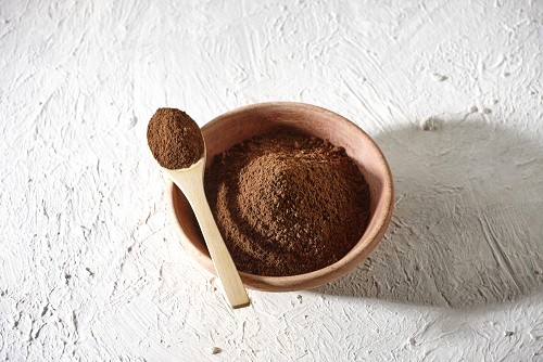 وعاء خشبي وملعقة خشبية ممتلئان ببودرة القرنفل على أرضية بيضاء
