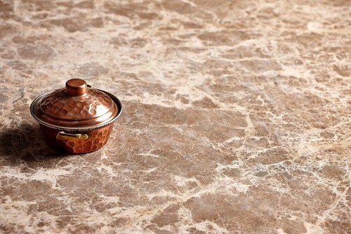 وعاء نحاسي صغير على خلفية رخام بيج