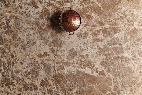 وعاء نحاسي صغير على خلفية من الرخام البيج