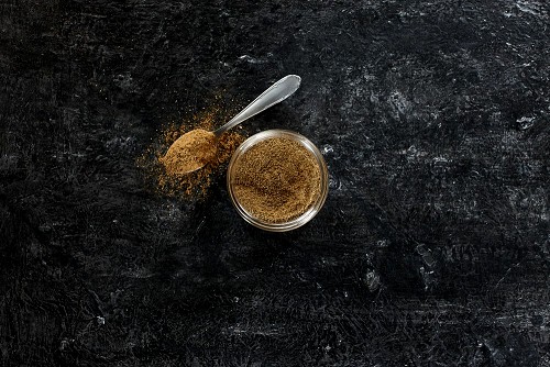 وعاء زجاجي للتوابل وملعقة معدنية ممتلئين ببودرة الكمون على خلفية سوداء