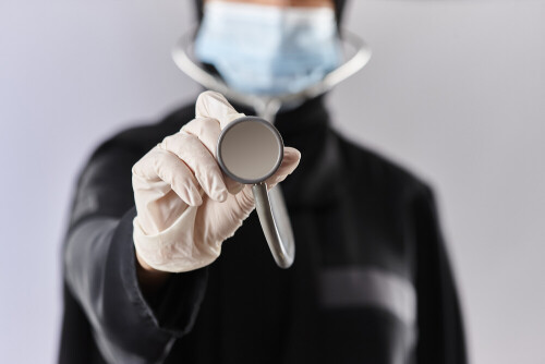 طبيبة ترتدي عباءة وملابس طبية في أوضاع متعددة