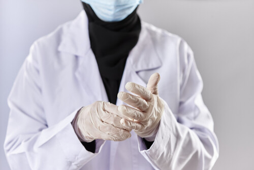 طبيبة ترتدي عباءة وملابس طبية في أوضاع متعددة