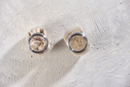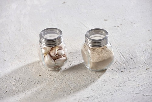وعاء زجاجي ممتلئ ببودرة الثوم علي خلفية بيضاء