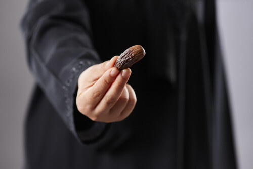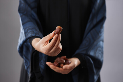 امرأة ترتدي عباءة تحمل أنواع مختلفة من التمر في أوضاع متعددة