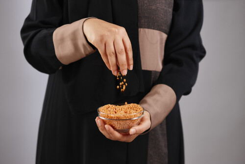 امرأة ترتدي عباءة تحمل أنواع مختلفة من البقوليات في أوضاع متعددة