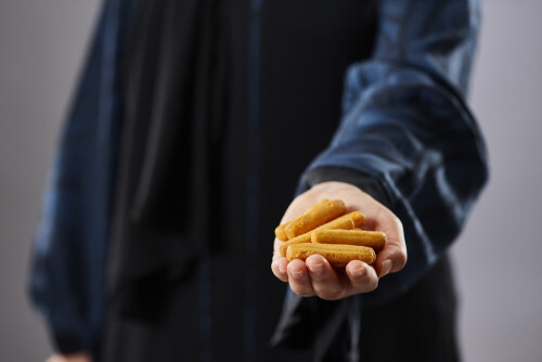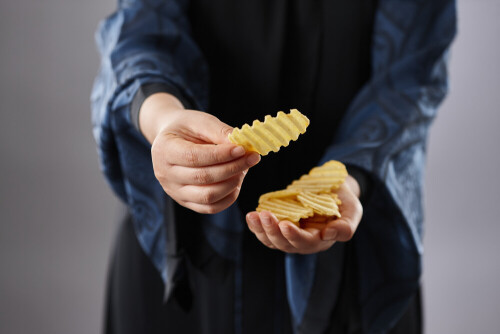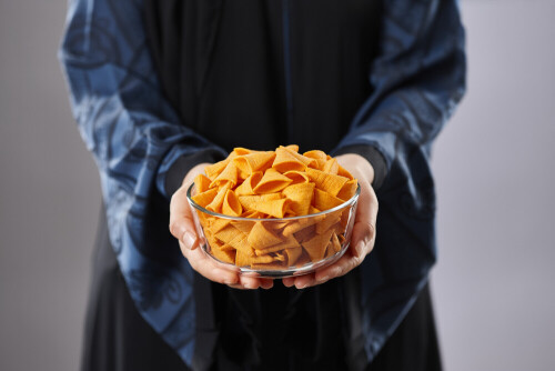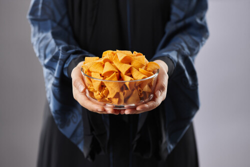 امرأة ترتدي عباءة تحمل أنواع مختلفة من الوجبات الخفيفة في أوضاع متعددة
