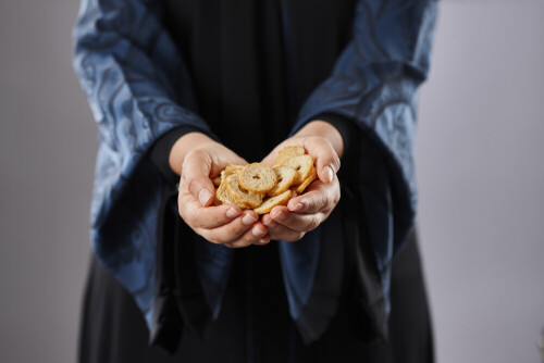 امرأة ترتدي عباءة تحمل أنواع مختلفة من الوجبات الخفيفة في أوضاع متعددة