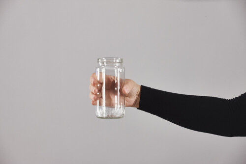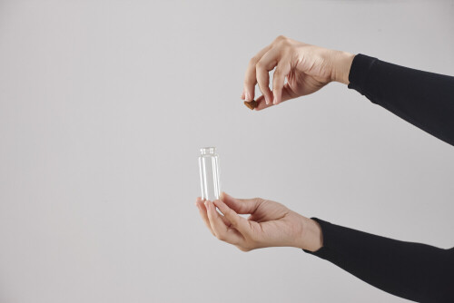 امرأة ترتدي عباءة سوداء تحمل أدوات زجاجية مختلفة في أوضاع متعددة