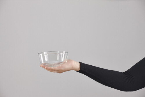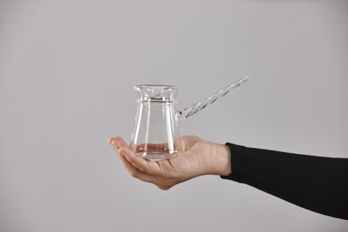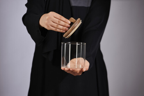 امرأة ترتدي عباءة سوداء تحمل أدوات زجاجية مختلفة في أوضاع متعددة