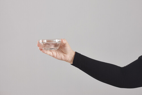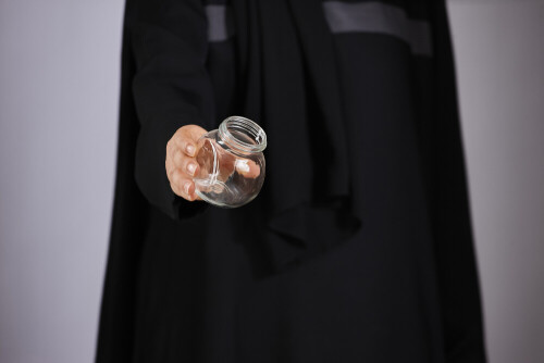 امرأة ترتدي عباءة سوداء تحمل أدوات زجاجية مختلفة في أوضاع متعددة