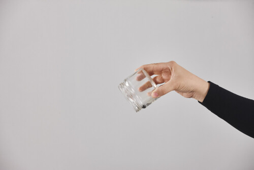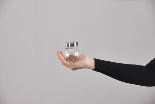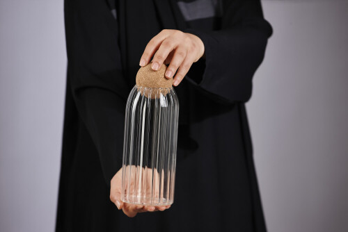 امرأة ترتدي عباءة سوداء تحمل أدوات زجاجية مختلفة في أوضاع متعددة