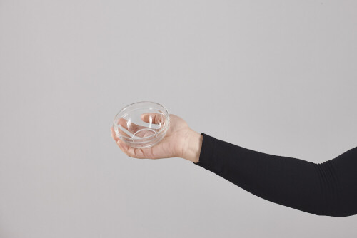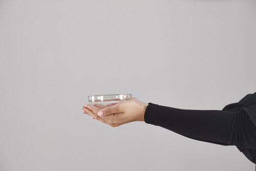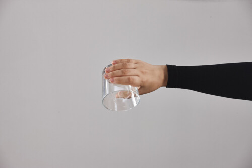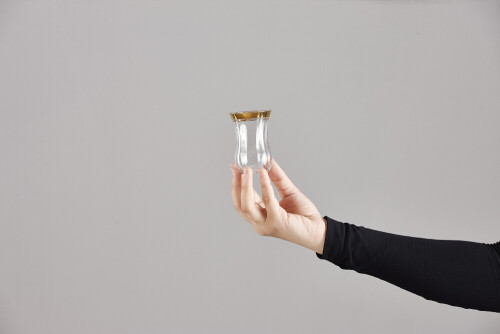 امرأة ترتدي عباءة سوداء تحمل أدوات زجاجية مختلفة في أوضاع متعددة