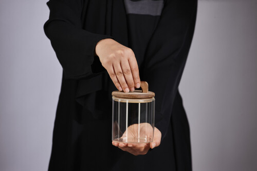 امرأة ترتدي عباءة سوداء تحمل أدوات زجاجية مختلفة في أوضاع متعددة