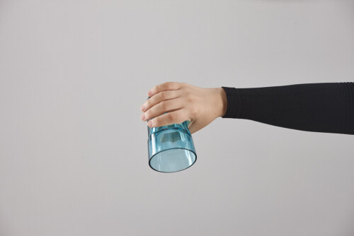 امرأة ترتدي عباءة سوداء تحمل أدوات زجاجية مختلفة في أوضاع متعددة
