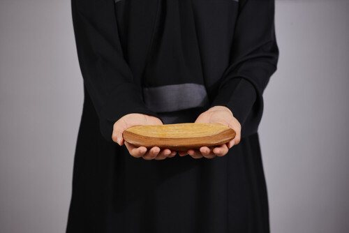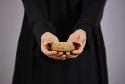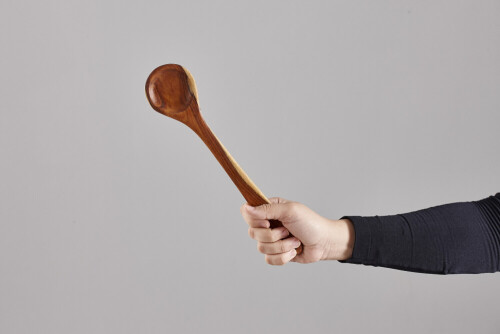 امرأة ترتدي عباءة سوداء تحمل أدوات خشبية مختلفة في أوضاع متعددة