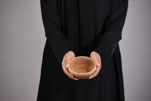 امرأة ترتدي عباءة سوداء تحمل أدوات خشبية مختلفة في أوضاع متعددة