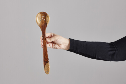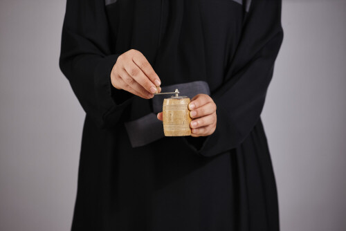 امرأة ترتدي عباءة سوداء تحمل أدوات خشبية مختلفة في أوضاع متعددة