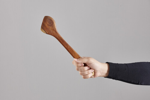 امرأة ترتدي عباءة سوداء تحمل أدوات خشبية مختلفة في أوضاع متعددة