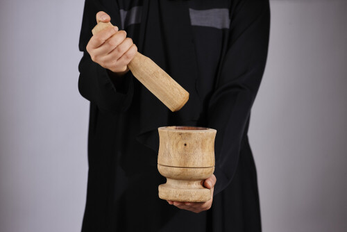 امرأة ترتدي عباءة سوداء تحمل أدوات خشبية مختلفة في أوضاع متعددة