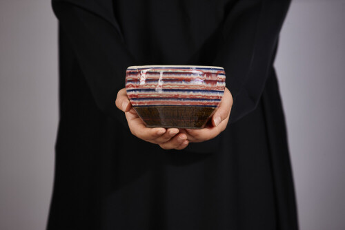امرأة ترتدي عباءة سوداء تحمل أدوات فخارية مختلفة في أوضاع متعددة