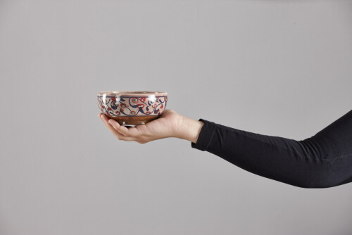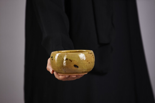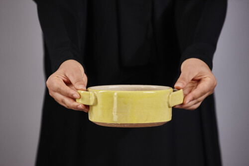 امرأة ترتدي عباءة سوداء تحمل أدوات فخارية مختلفة في أوضاع متعددة