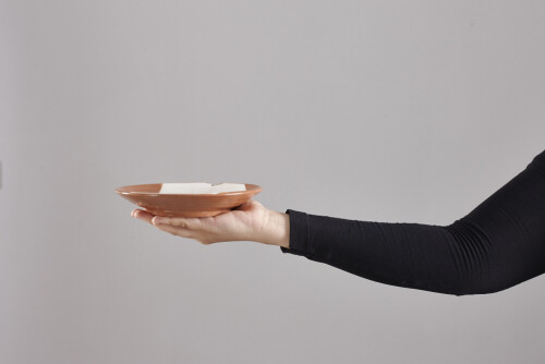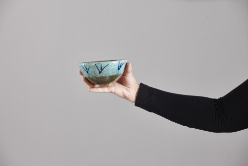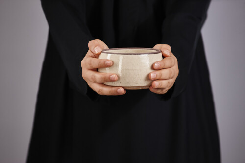 امرأة ترتدي عباءة سوداء تحمل أدوات فخارية مختلفة في أوضاع متعددة