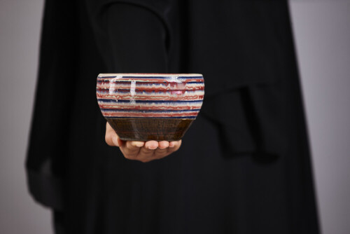 امرأة ترتدي عباءة سوداء تحمل أدوات فخارية مختلفة في أوضاع متعددة