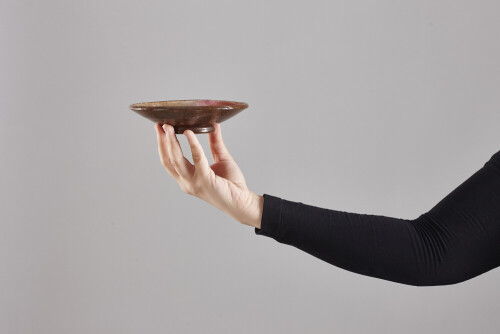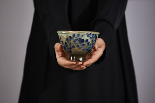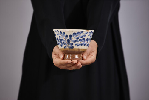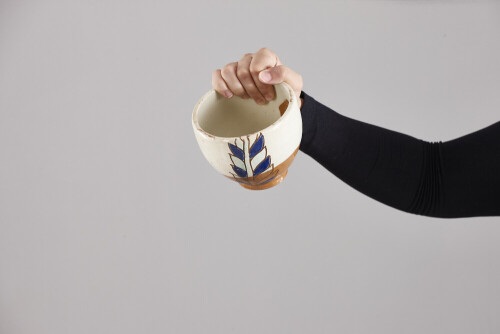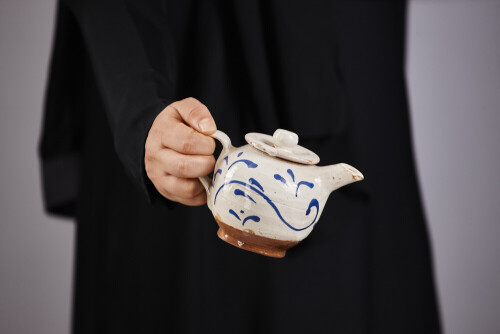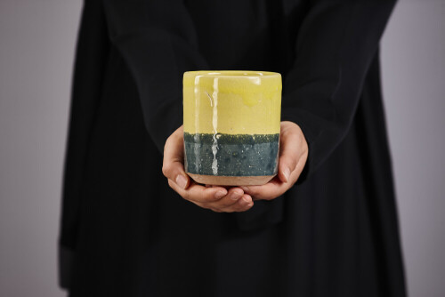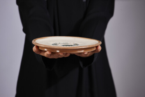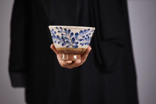 امرأة ترتدي عباءة سوداء تحمل أدوات فخارية مختلفة في أوضاع متعددة