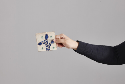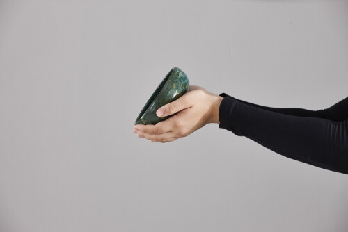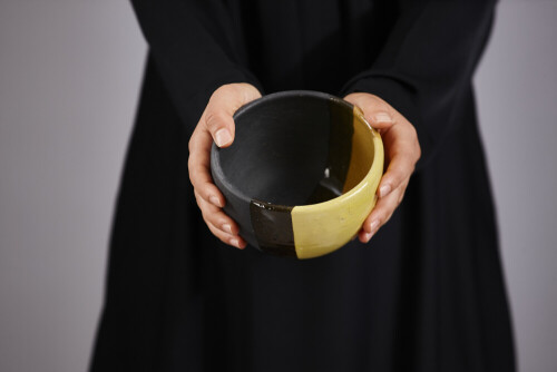 امرأة ترتدي عباءة سوداء تحمل أدوات فخارية مختلفة في أوضاع متعددة