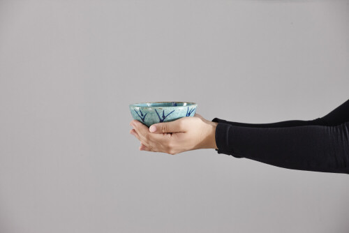 امرأة ترتدي عباءة سوداء تحمل أدوات فخارية مختلفة في أوضاع متعددة
