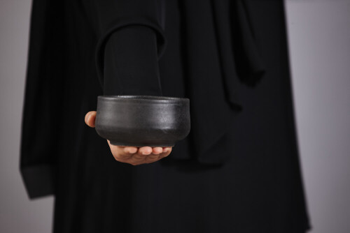 امرأة ترتدي عباءة سوداء تحمل أدوات فخارية مختلفة في أوضاع متعددة