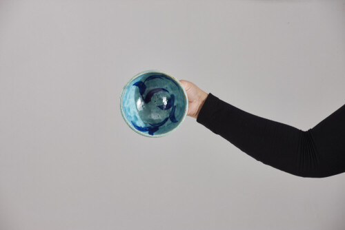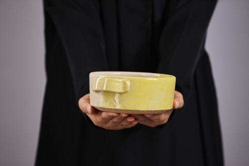امرأة ترتدي عباءة سوداء تحمل أدوات فخارية مختلفة في أوضاع متعددة