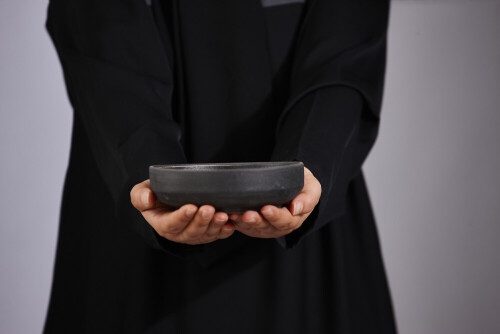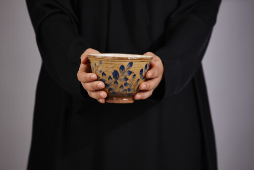 امرأة ترتدي عباءة سوداء تحمل أدوات فخارية مختلفة في أوضاع متعددة