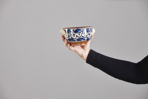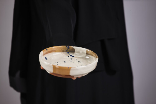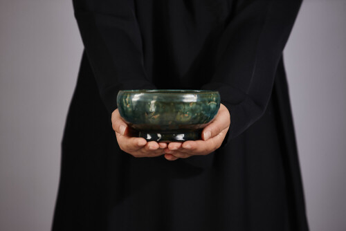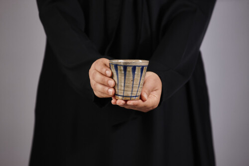 امرأة ترتدي عباءة سوداء تحمل أدوات فخارية مختلفة في أوضاع متعددة