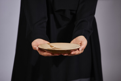 امرأة ترتدي عباءة سوداء تحمل أدوات فخارية مختلفة في أوضاع متعددة