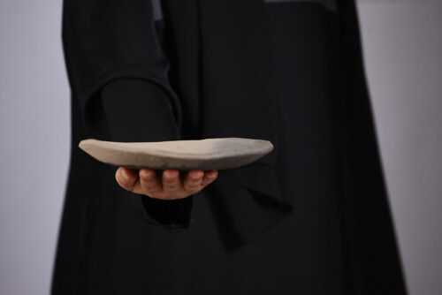 امرأة ترتدي عباءة سوداء تحمل أدوات فخارية مختلفة في أوضاع متعددة