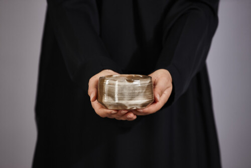 امرأة ترتدي عباءة سوداء تحمل أدوات فخارية مختلفة في أوضاع متعددة
