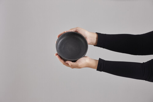امرأة ترتدي عباءة سوداء تحمل أدوات فخارية مختلفة في أوضاع متعددة