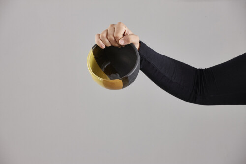 امرأة ترتدي عباءة سوداء تحمل أدوات فخارية مختلفة في أوضاع متعددة
